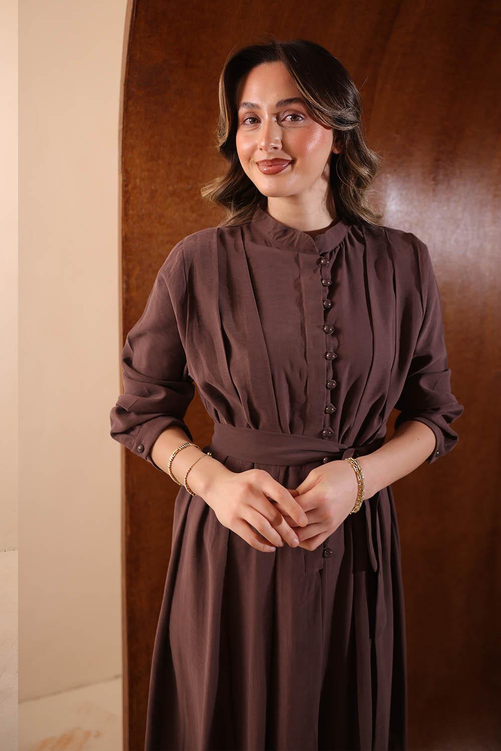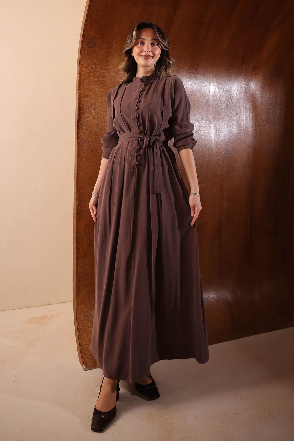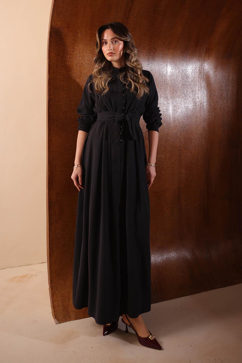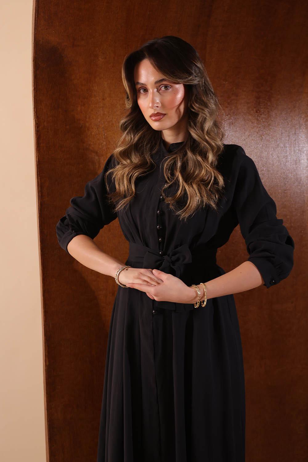 VAYNÈS Milano'nun tasarım gücünü yansıtan Aria Diagonal Elbise, kumaşın kendi dokusundaki çapraz yolları modern bir kesimle birleştiriyor. Önden boydan boya düğme detayı ve omuzdan süzülen diagonal katmanlar, elbiseye hem derinlik hem de güçlü bir karakter kazandırıyor.