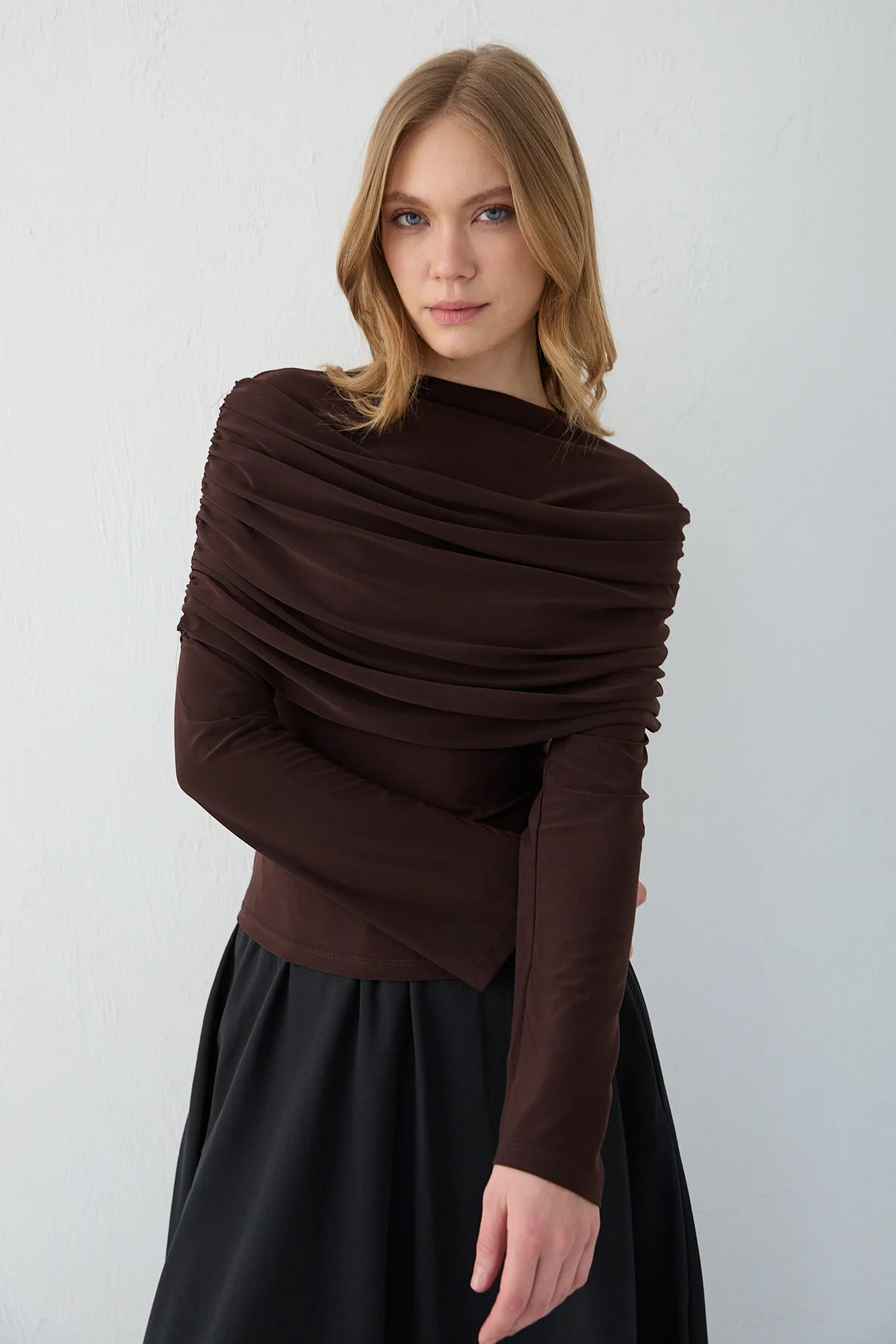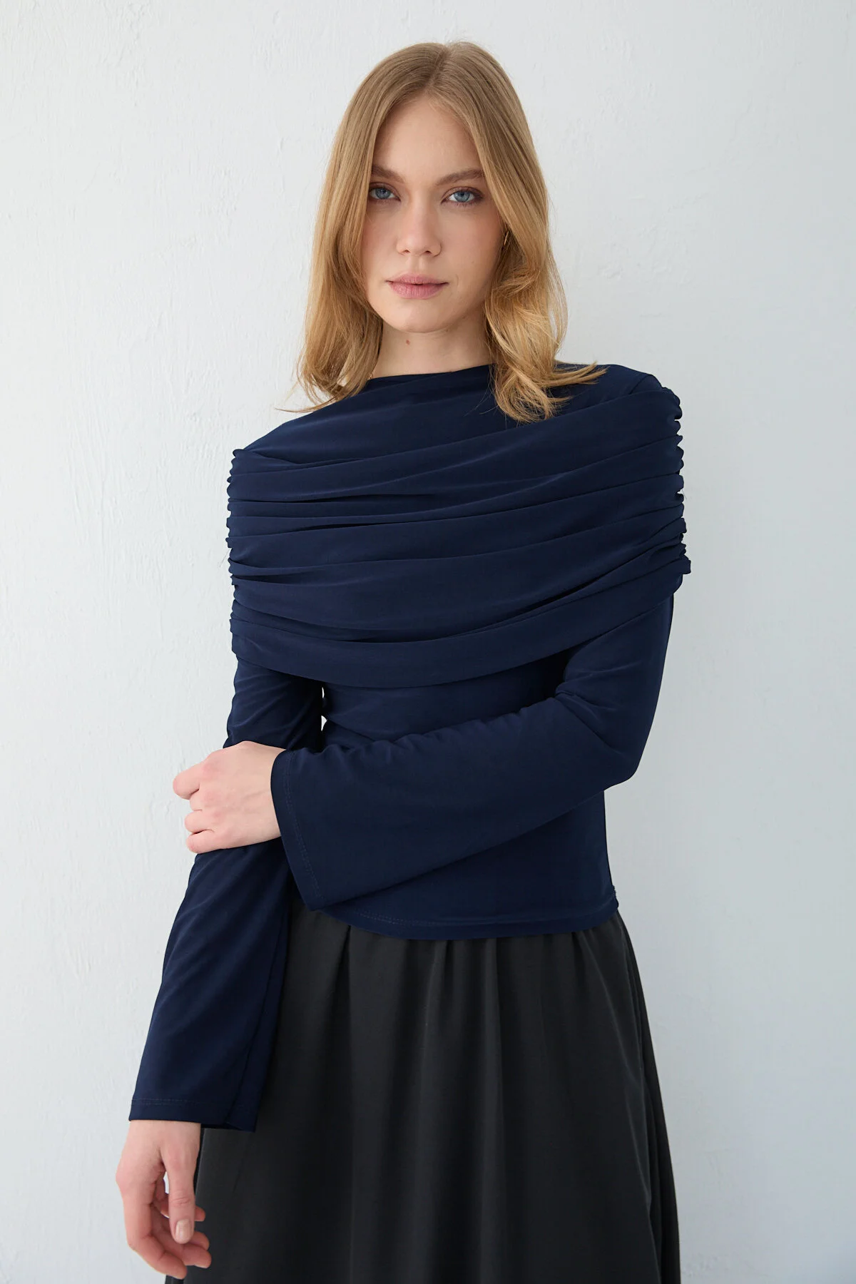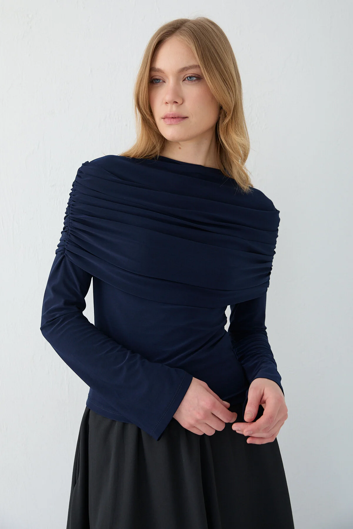 Kayık yaka formu ve ön-arka drape detayları sayesinde vücuda zarif bir şekilde oturur ve dengeli bir siluet oluşturur. Esnek Sandy kumaş yapısı, gün boyu konfor sunarken hareket özgürlüğü sağlar.