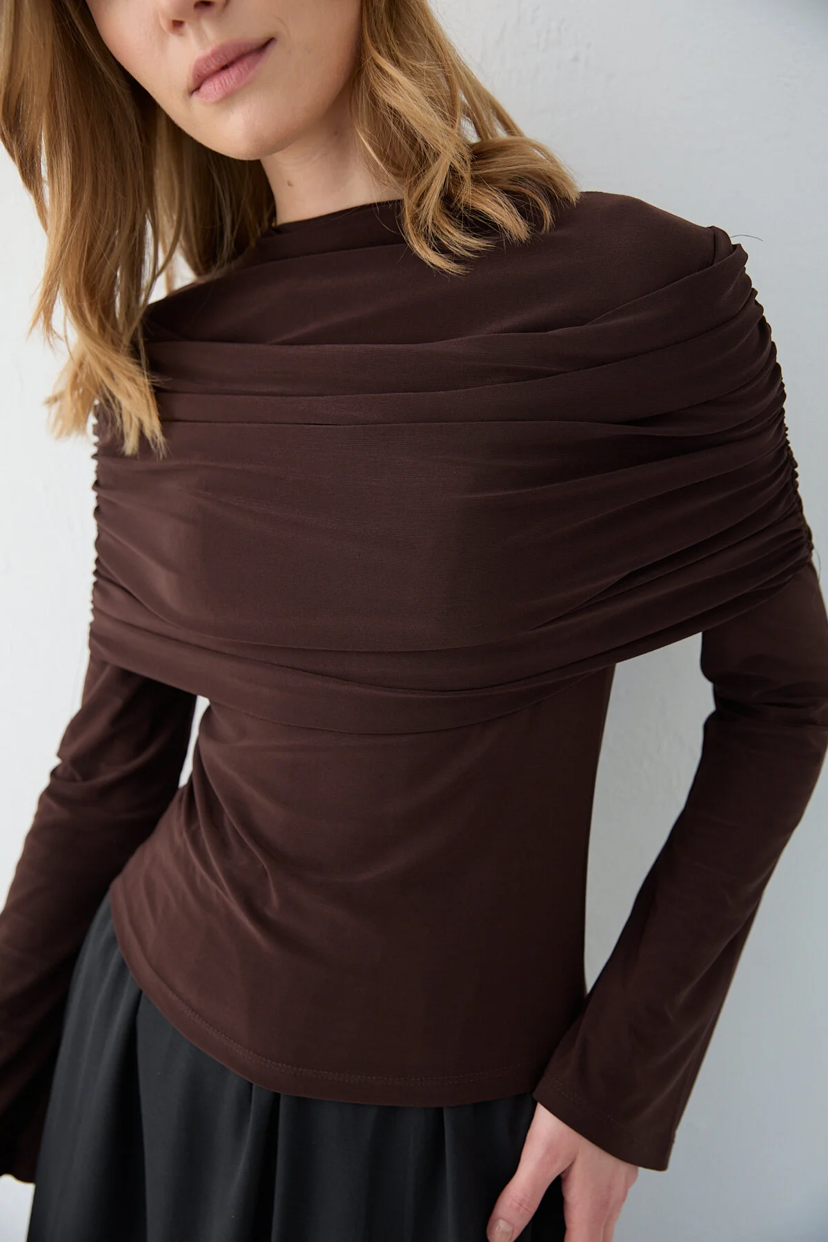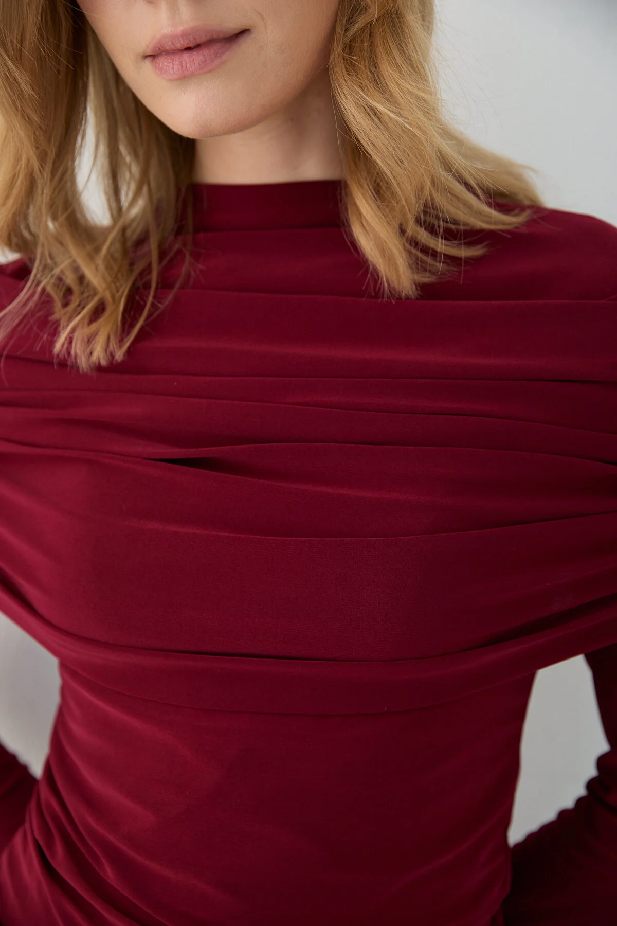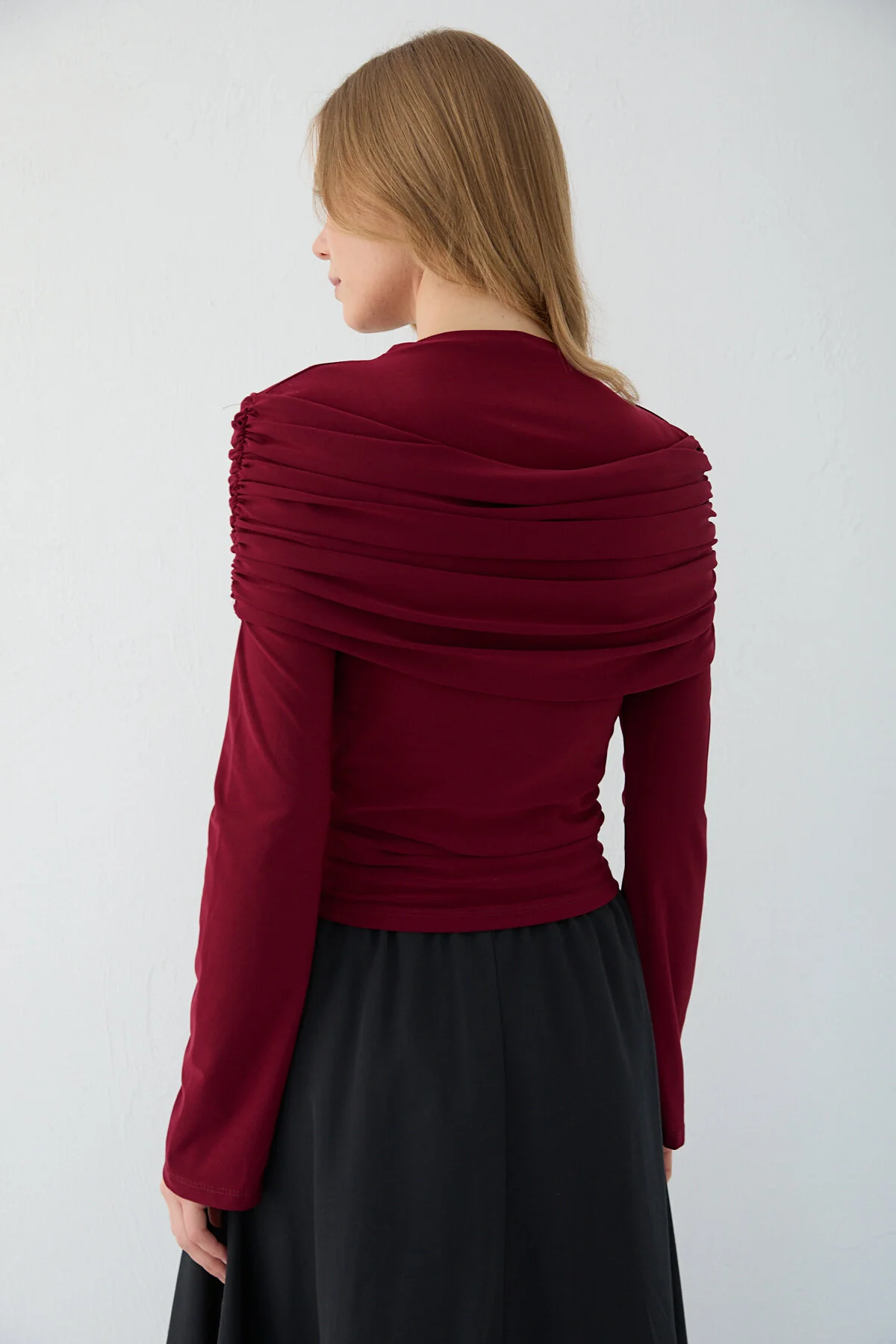 Kayık yaka formu ve ön-arka drape detayları sayesinde vücuda zarif bir şekilde oturur ve dengeli bir siluet oluşturur. Esnek Sandy kumaş yapısı, gün boyu konfor sunarken hareket özgürlüğü sağlar.