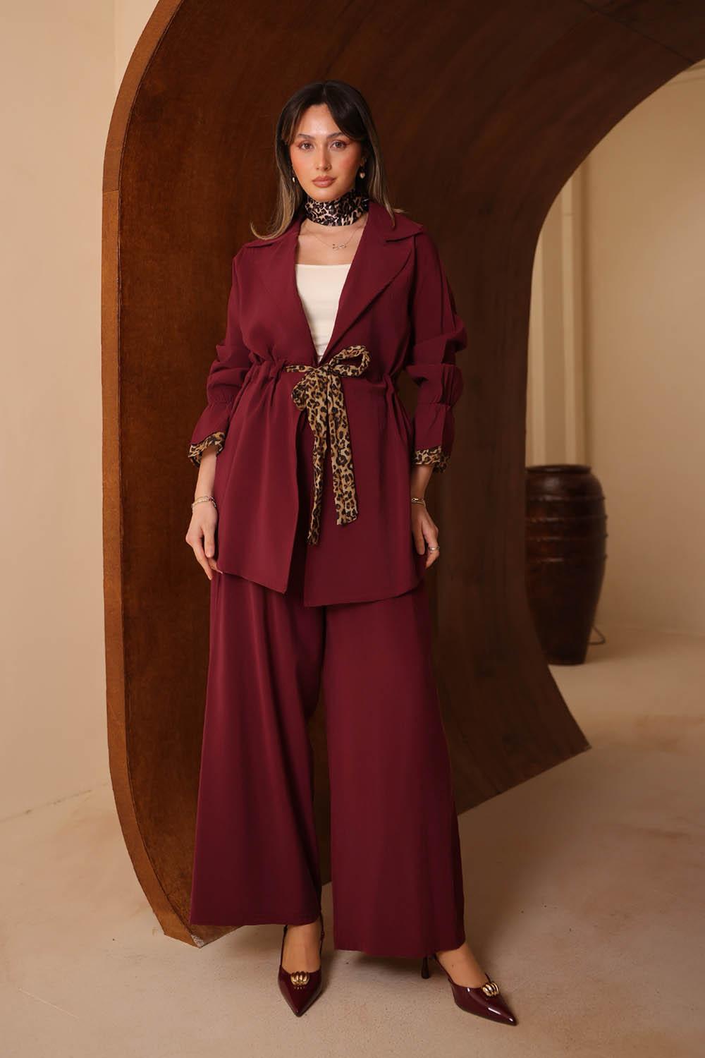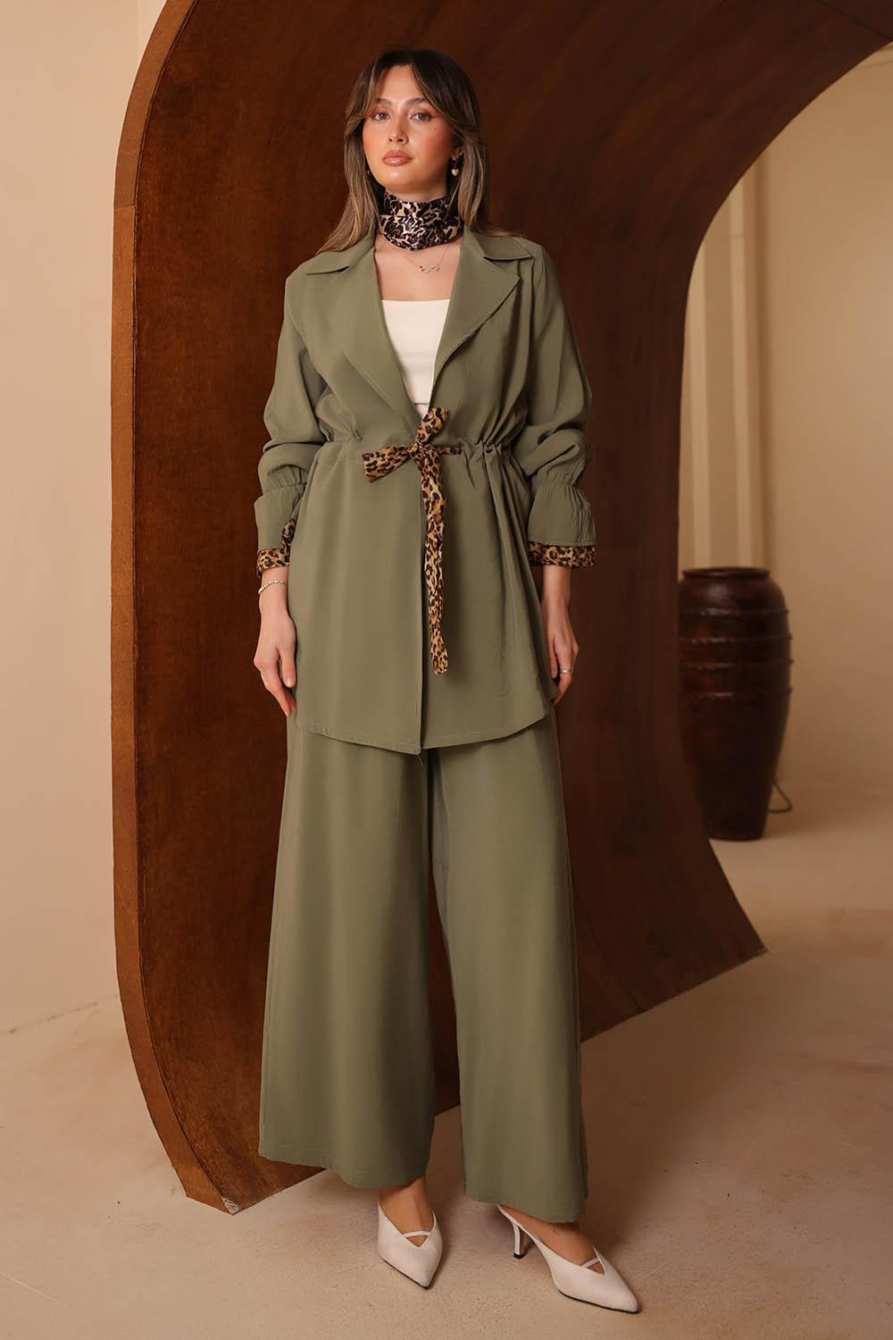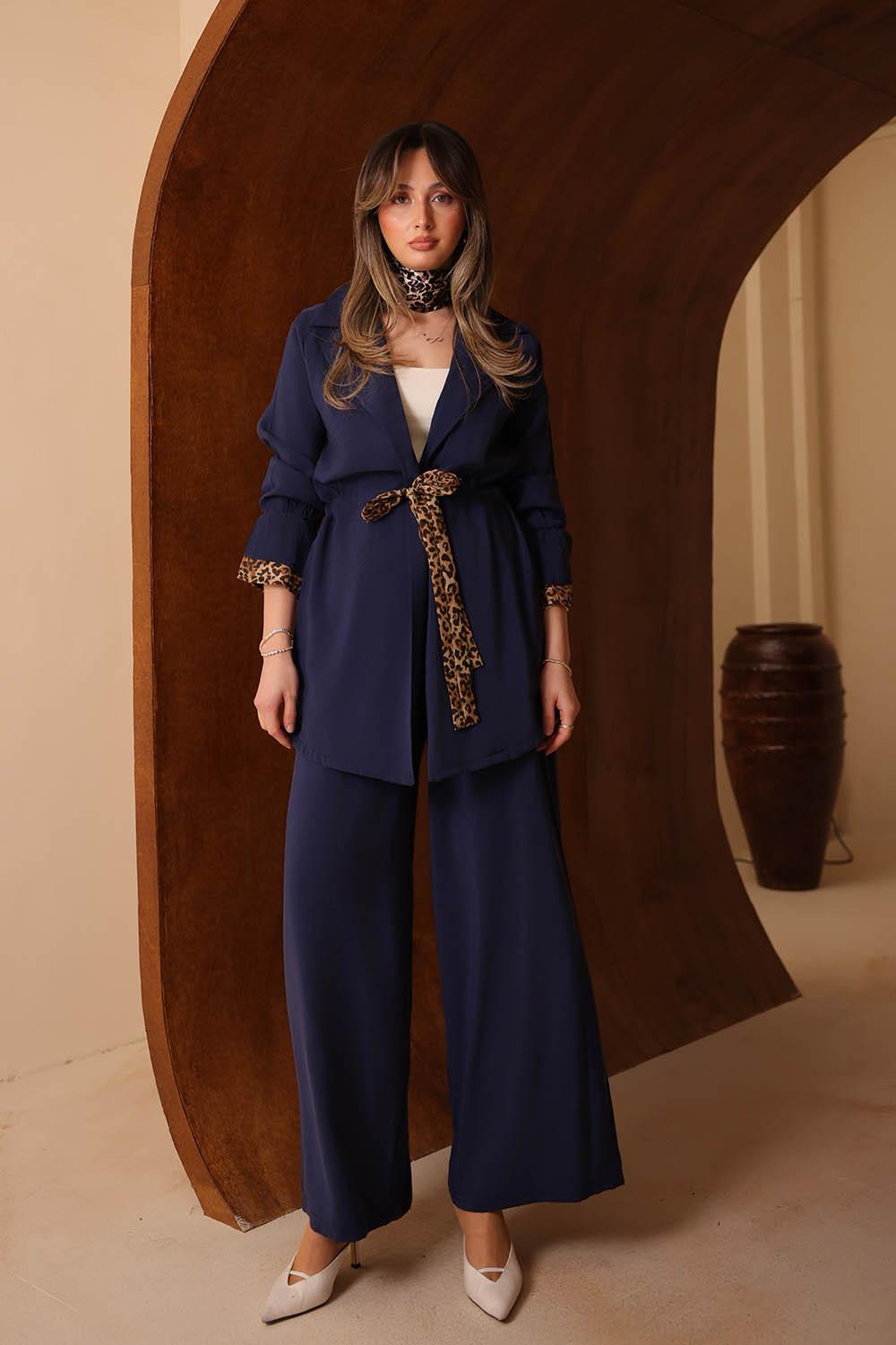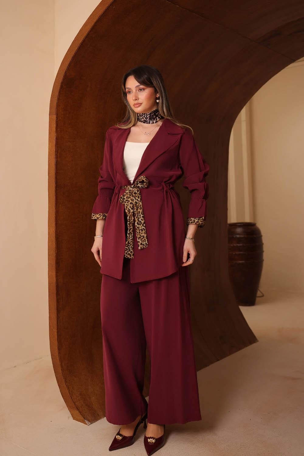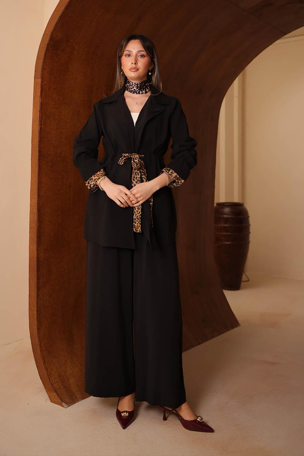 VAYNÈS Milano'nun yeni sezonunda öne çıkan bu modal takım, ince leopar desen detaylarını sessiz lüks estetiğiyle harmanlıyor. Dökümlü modal kumaşın tenle barışık yapısı, gün boyu konforlu bir kullanım sunarken zarif silüeti her ortamda şıklığı tamamlıyor. Ceket ve pantolondan oluşan ikili set; iş toplantılarından akşam davetlerine kadar geniş bir kullanım alanı sunuyor. Renk seçenekleri ile gardırobunuzun vazgeçilmezi olmaya aday.
